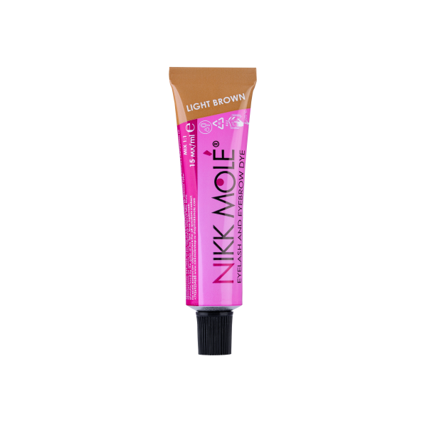 Светло-коричневая краска для бровей — это теплый, светлый оттенок красителя. Идеально подходит для блондинок, а также для тех, у кого светло-русые и русые волосы. Деликатно окрашивает волоски бровей и кожу, благодаря чему цвет получается более мягкий, а брови выглядят очень естественно. Несмотря на то, что это самый светлый цвет линейки красителя Nikk Mole, он хорошо ложится на кожу и отлично ее окрашивает.