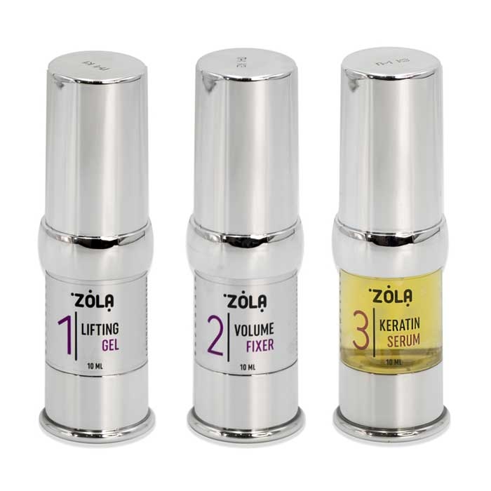 Zola Brow&Lash Lamination System – это коллекция специальных средств для ламинирования бровей. В нее входят составы, которые используются мастером на каждом из этапов процедуры: – Lifting gel Keratin – для смягчения кутикулы волосков, поднятия чешуек, чтобы улучшить проницаемость активных компонентов; – Volume Fixer – для восстановления диффузных связей, фиксации формы, закрытия чешуек на волосках; – Keratin Serum – для бережного ухода.