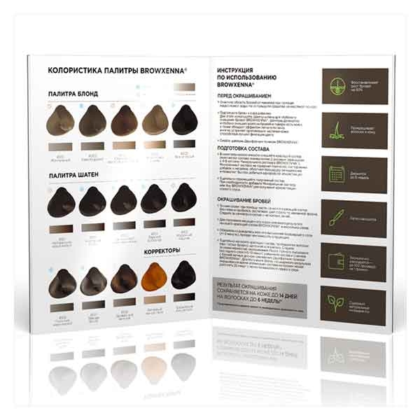 Палитра оттенков хны для бровей BrowXenna® — удобный каталог, где собраны все оттенки натуральной Хны BrowXenna®.Помимо наглядной демонстрации цвета на искусственных волосах, в нем также описана инструкция по работе с Хной BrowXenna®.Палитра оттенков BrowXenna® — надежный помощник в работе мастера.