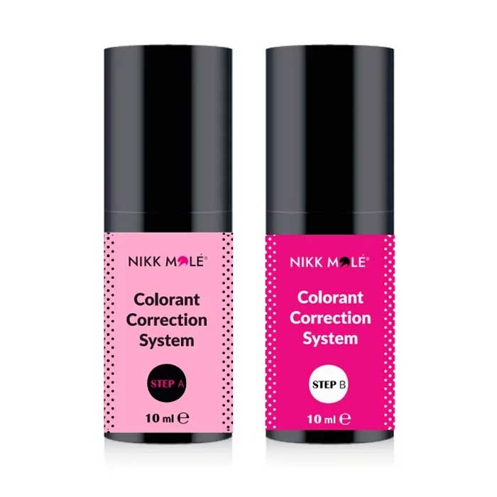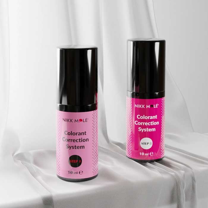 Система для удаления и коррекции цвета – Nikk Mole Colorant Correction SystemNikk Mole Colorant Correction System – это профессиональная система для бровей по удалению и коррекции цвета из двух компонентов Step А и Step В.Двухкомпонентная система коррекции цвета Никк Моле предназначена для мягкого удаления накопленного искусственного красителя на бровях на 2-3 тона или коррекции нежелательных оттенков окрашеных волосков на 1-2 тона.Основной принцип действия составляющих Nikk Mole состоит в уменьшении размера окисленной красящей молекулы, что позволяет легче вывести краску из волос и корректировать цвет после окрашивания.Составы Step А и Step В максимально безопасны для строения волоска и не наносят вред натуральному меланину.Средство для удаления и коррекции искусственного красителя с бровей не содержит:- аммиак;- перекись водорода.Компоненты А и В взаимодействуют только друг с другом. Только для профессионального использования.